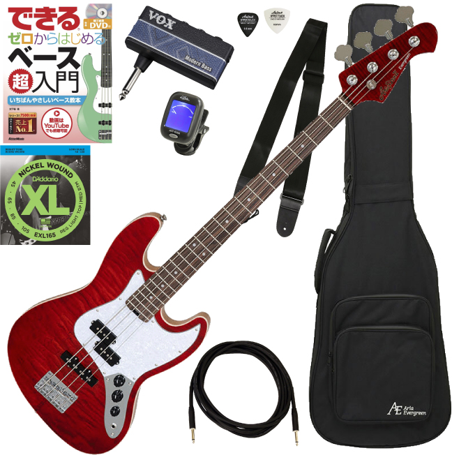 フレイムメイプルに鮮やかなカラーとパーロイドピックガード、PJ タイプ2つのピックアップを組み合わせた"Aria Pro II STB-AE200"に、AE ロゴ刺繍入りABC-300 ギグバッグ、練習に便利な9種のリズム・パターンを内蔵したヘッドホンアンプ"VOX amPlug3" 、入門者向けDVD付き教則本(リットーミュージック)、クリップチューナー、ストラップ、シールド(3m)、ピック、替弦(D'Addario EXL165)をセットにしました。