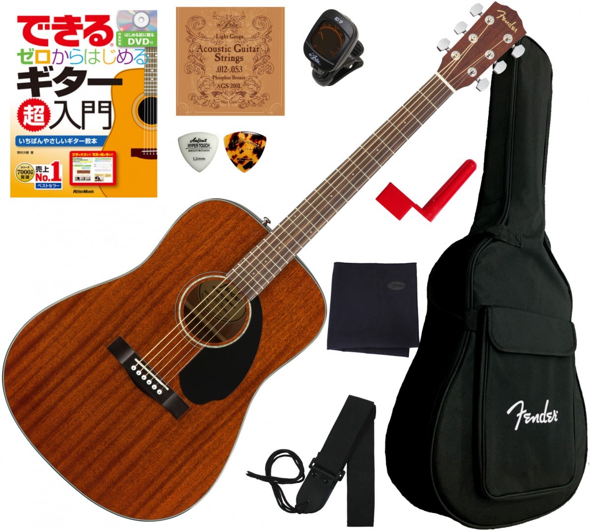ボディトップに単板マホガニー、サイド&バックにもマホガニーを採用したドレッドノートボディの『Fender CD-60S』に、ソフトケース、入門者向け教則本の決定版"できる ゼロからはじめるギター超入門(DVD付)"、クリップチューナー、ピック、ストラップ、クロス、ストリングワインダー、弦をセットにしました。