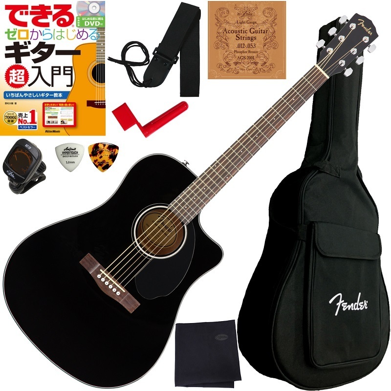 ボディトップに単板マホガニー、サイド&バックにもマホガニーを採用し、Fishman Classic Designピックアップ/プリアンプ搭載したドレッドノートボディの『Fender CD-60SCE』に、ソフトケース、入門者向け教則本の決定版"できる ゼロからはじめるギター超入門(DVD付)"、クリップチューナー、ピック、ストラップ、クロス、ストリングワインダー、弦をセットにしました。