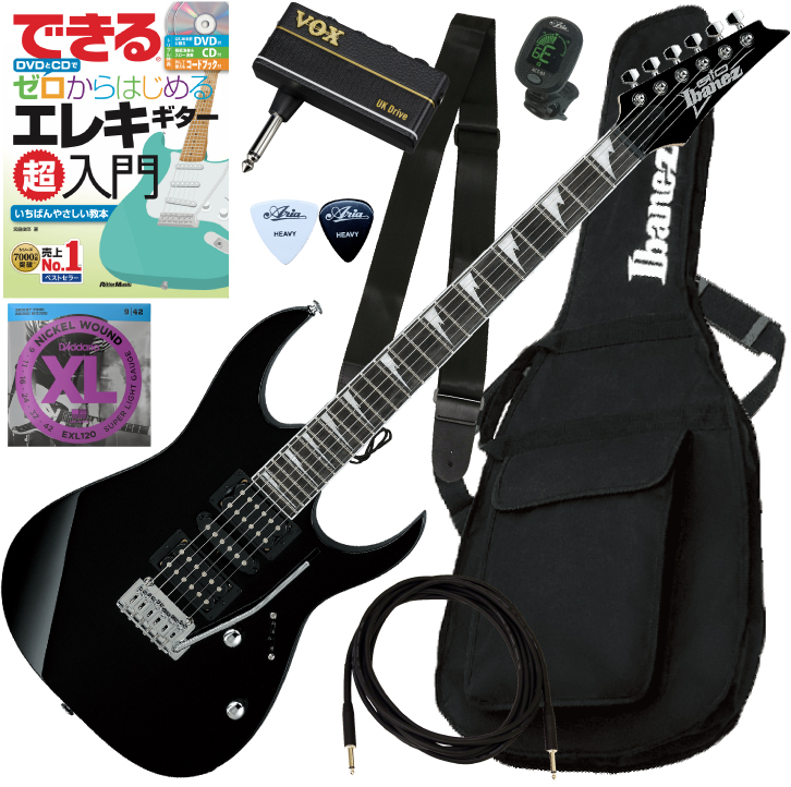 指板材にパープルハート材を、ネックにはメイプル材を使用した、Ibanez GRG171DXに、ソフトケース、練習に便利なヘッドホンアンプ"VOX amPlug 3" 、入門者向けDVD付教則本(リットーミュージック)、クリップチューナー、ストラップ、シールド(3m)、ピック、クロス、替弦をセットにしました。