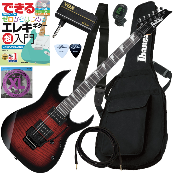 指板材には硬質で狂いが少ないパープルハート材を、ネックにはメイプル材を使用した、Ibanez GRG320FAに、ソフトケース、練習に便利なヘッドホンアンプ"VOX amPlug 3" 、入門者向けDVD付教則本(リットーミュージック)、クリップチューナー、ストラップ、シールド(3m)、ピック、クロス、替弦をセットにしました。