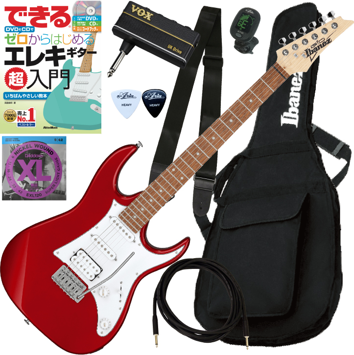 指板材には褐色の木肌と木目を持つ硬質なジャトバ材を、ネックにはメイプル材を使用した、Ibanez GRG40に、ソフトケース、練習に便利なヘッドホンアンプ"VOX amPlug 3" 、入門者向けDVD付教則本(リットーミュージック)、クリップチューナー、ストラップ、シールド(3m)、ピック、クロス、替弦をセットにしました。
