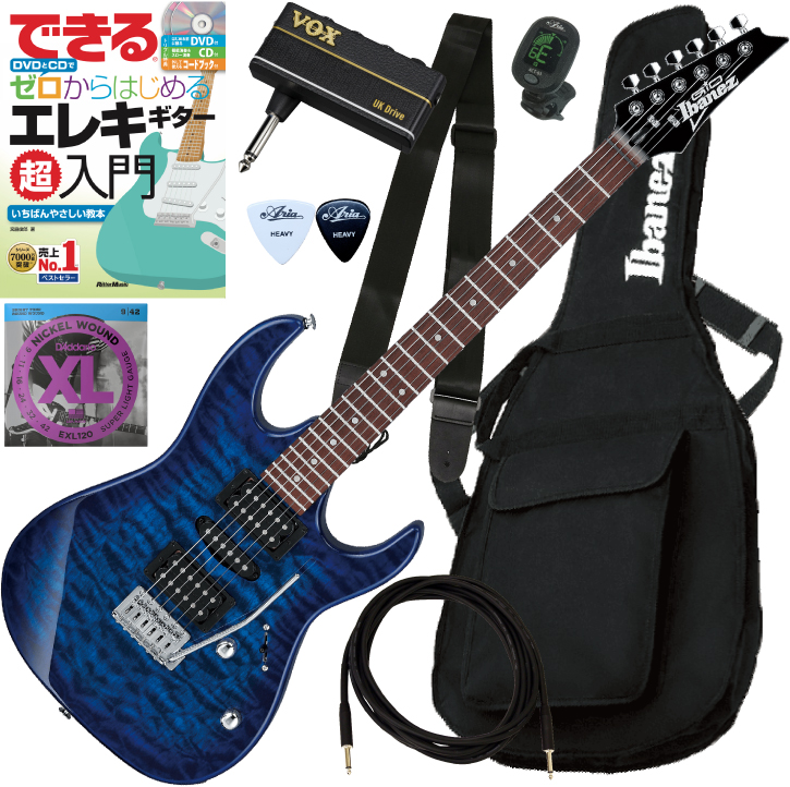 指板材には褐色の木肌と木目を持つ硬質なジャトバ材を、ネックにはメイプル材を使用した、Ibanez GRX70QAに、ソフトケース、練習に便利なヘッドホンアンプ"VOX amPlug 3" 、入門者向けDVD付教則本(リットーミュージック)、クリップチューナー、ストラップ、シールド(3m)、ピック、クロス、替弦をセットにしました。