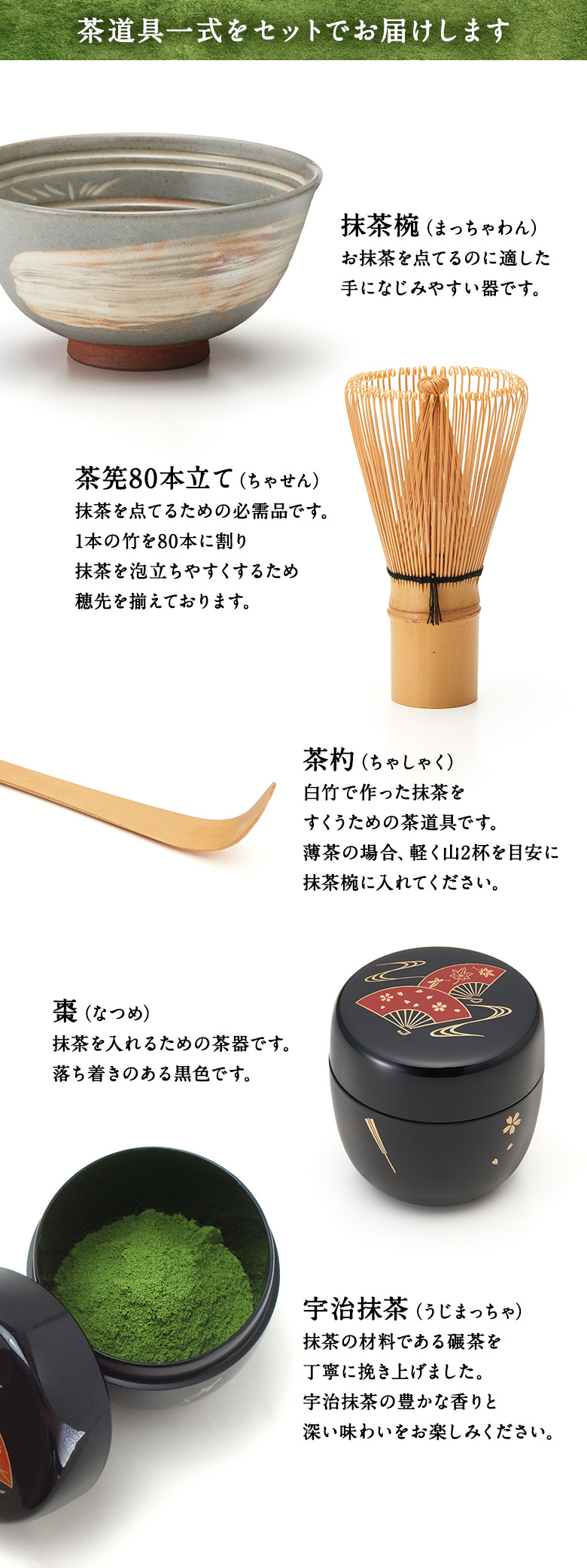 〔抹茶碗、棗、茶杓、茶筅〕各1個