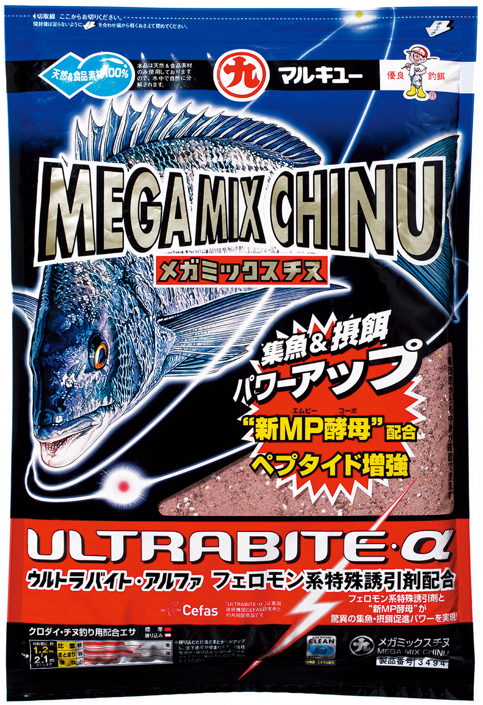 『ウルトラバイト・アルファ』と、うまみのもとであるアミノ酸の結合体、ペプタイドを増強した“新MP酵母”を配合し、マルキユーのチヌ用配合エサ中、最強の集魚・摂餌効果を発揮。4種類の粒である、カキガラ、押しムギ、トウモロコシ、ムギペレットが、チヌの視覚にも強くアピールします。さらに、海中でスロープ状に拡散し、有効ゾーンを形成して、広範囲に威力を発揮。エサの練り込み加減で、表層から深層まで対応。釣り場・釣況を選びません。
