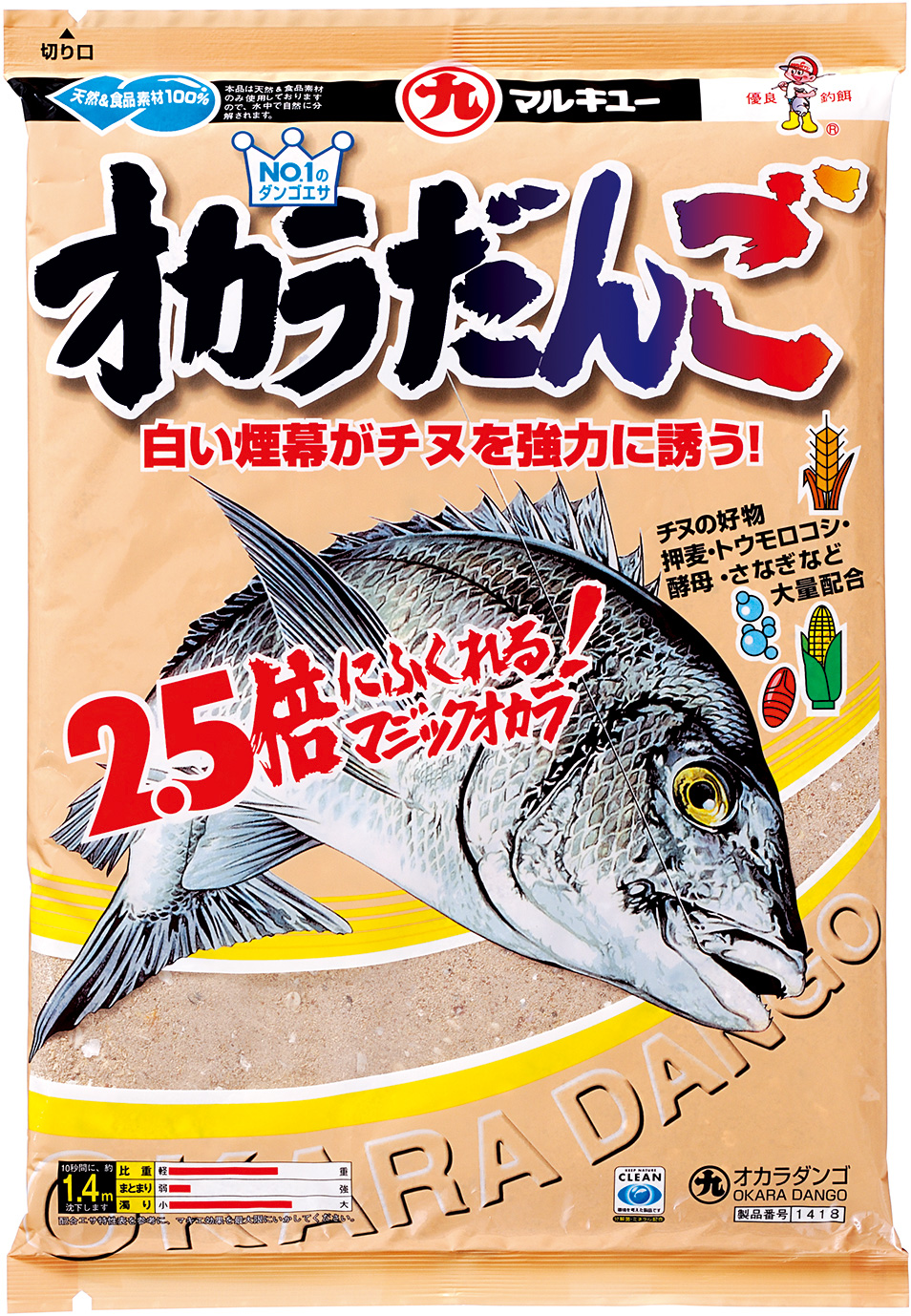 特殊なオカラを主原材料に押しムギ、トウモロコシ、酵母、さなぎなどを配合。水を加えると2.5倍に膨れ、強力な濁りでチヌの警戒心を解きます。お好みの配合エサとブレンドすれば、ヒシャク離れがよくなり飛距離がのびます。