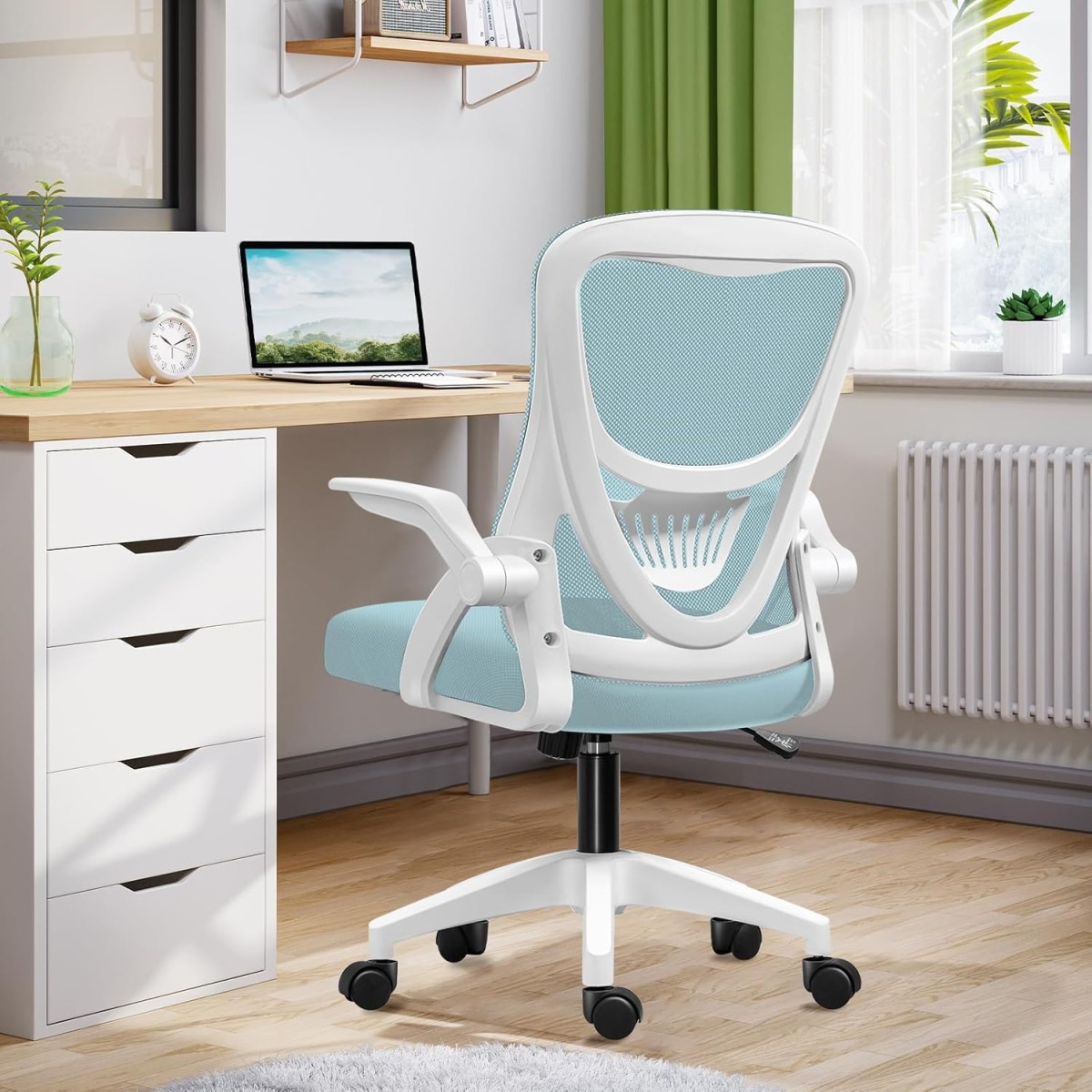 ★【跳ね上げ式アームレスト】 このオフィスチェアは、跳ね上げ式のアームレストを備えており、90度回転できるように設計されているため、自由に使用することができます。使わないときはアームレストを引き上げて、どのデスクの高さにもすっきりと収納できるので、部屋のスペースを有効に活用できます。