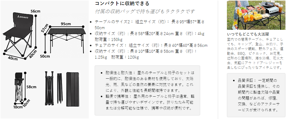 ★【多様なシーンで活躍】 この多機能の屋外折りたたみテーブル&チェアセットは、さまざまなシーンやアクティビティに適しています。ピクニック、キャンプ、釣り、郊外旅行、屋外作業など、さまざまなニーズに対応します。家族や友人と快適で便利な屋外体験を楽しむことができます。 |