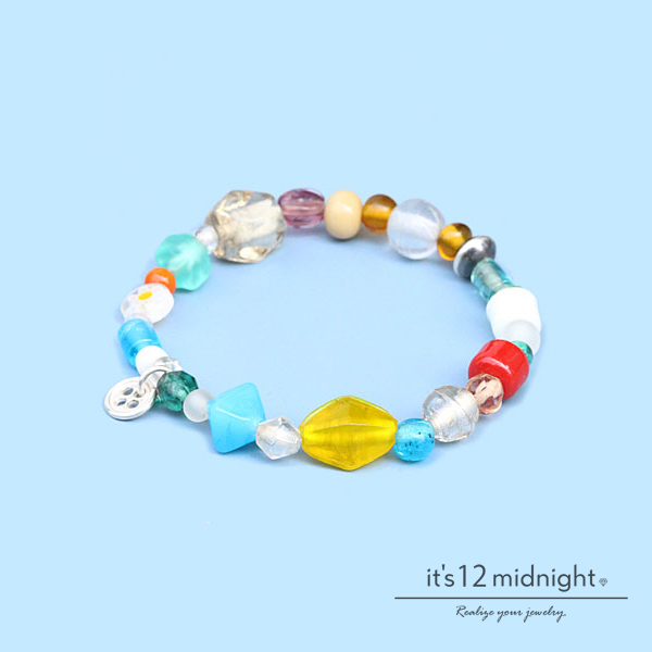 カラフルで透明感あふれるヴィンテージビーズにセットしたボタン型ブランドチャームは、シルバー925製のit's 12 midnightオリジナル。