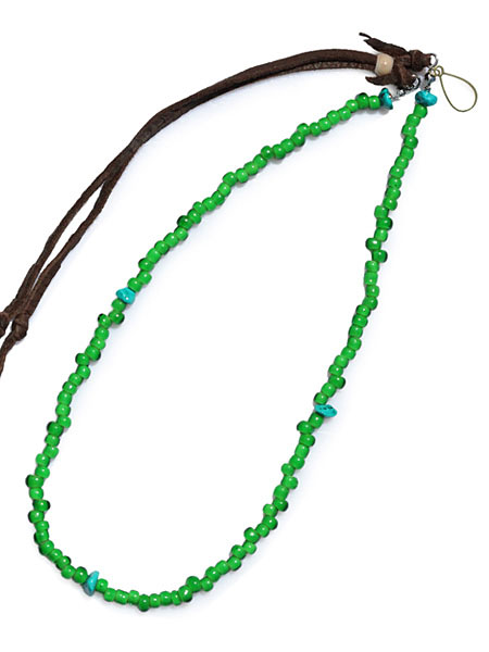 色鮮やかなチェコ産のホワイトハーツビーズと深い色合いが特徴的な天然ターコイズに強靭なディアスキンレザーを組み合わせたネックレス&ブレスレット。