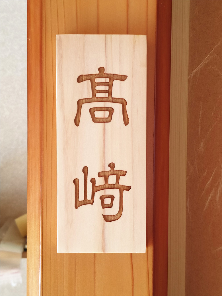 国産ヒノキにレーザー彫刻の、小型かわいらしい表札です。