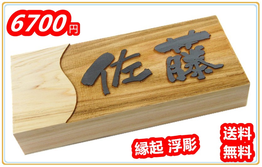 木製表札 表札 裏穴 浮彫り 彫刻加工 国産桧 檜表札 天然銘木 横型表札 (逸工房) 18×8×3cm