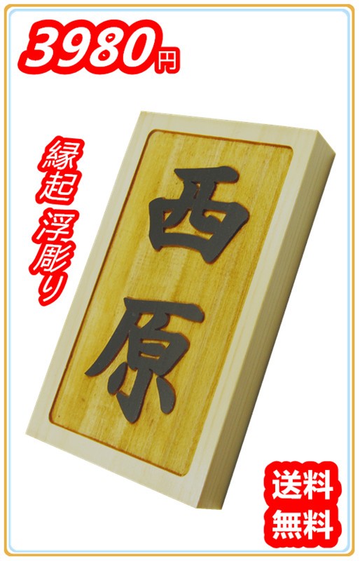 木製表札 表札 裏穴 浮き彫り 彫刻加工 国産桧 檜表札 天然銘木 14.5×8.5×2cm 逸工房
