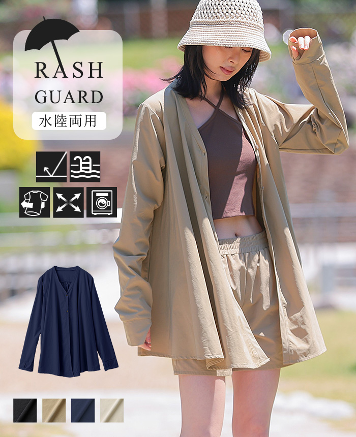 海やアウトドアに欠かせない、ラッシュガードシリーズが登場。紫外線カットや速乾、海やプールに入っても劣化しにくい等、多機能な生地を使ったアイテムをご紹介します。さっと気軽に羽織れるフレアシルエットのカーディガン。フロントはボタンが2つあり着崩れをサポート。袖口は指穴付きで、手の甲も紫外線をしっかりブロックしてくれます。ストレッチ性があるので動きやすく、ストレスフリーな着心地。幅広いシーンで活躍してくれる、おすすめの1枚です。