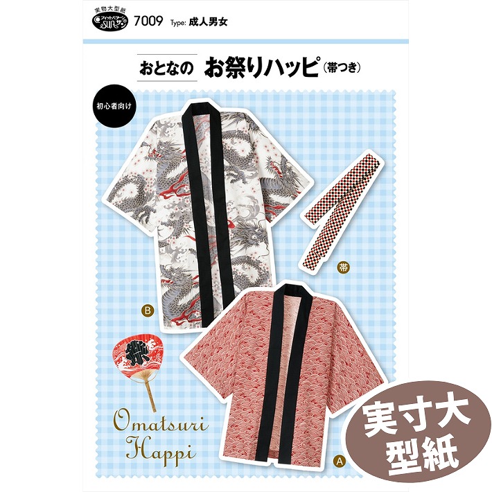 | 特 徴 | 切り取ってそのまま使える実寸大の型紙です。 詳しい説明書つきで初心者さんも安心♪ おとなサイズのハッピ(法被)が作れます、お祭りやイベントで大活躍。 直線縫いが中心なので初心者さんでも簡単に仕上がります。 《Aデザイン》は筒袖の袖口と衿に別布を使用したノーマル身丈 《Bデザイン》は衿に別布を使用した長めの身丈 帯のパターンつき。 《Aデザイン》はパネル柄(110cm幅・長さ105cm・一方柄)の布地を使用できます。 作り方もかんたん!綿のブロード・シーチングやポリエステルのサテン生地で作るのがおすすめです。 衿、袖口の裏と帯は別布にしてアクセントに。 お気に入りの布で作ったハッピで夏を楽しみましょう! 【おすすめの生地は ⇒ こちら】 |