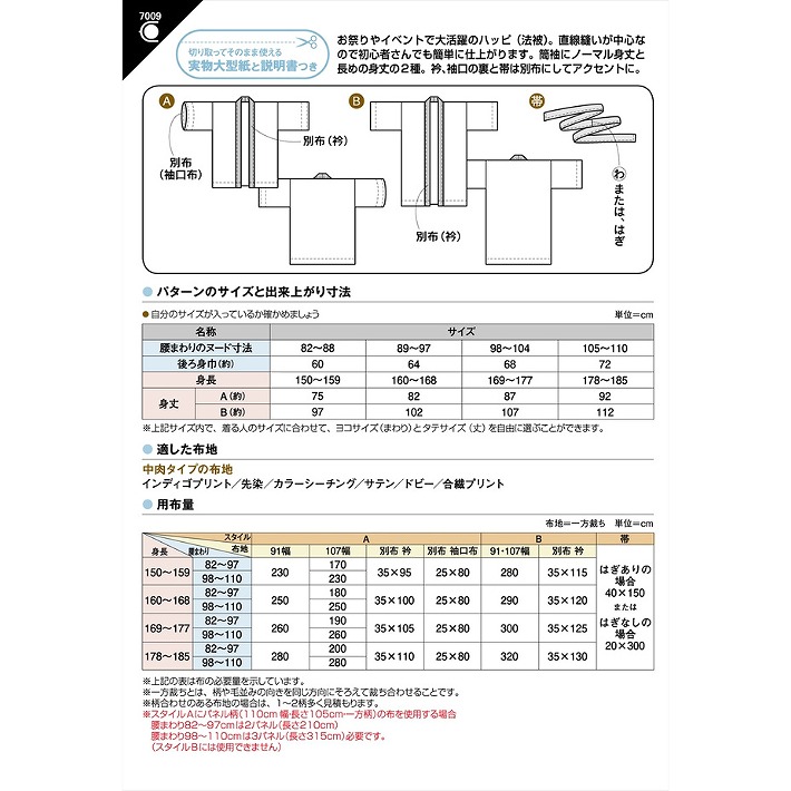 | 必要な材料 | ●布地:(約91cm幅)《A》230〜280cm、《B》280〜320cm :(約107cm幅)《A》170〜280cm、《B》280〜320cm :別布(衿)《A》35×95〜110cm、《B》35×115〜130cm :別布(袖口)《A》25×80cm、《B》35×115〜130cm :帯(はぎあり) 40×150cm、 または(はぎなし) 20×300cm ※《A》にパネル柄の布を使用する場合、腰まわり82〜97cmは2パネル(長さ210cm)、腰まわり98〜110cmは3パネル(長さ315cm)必要です。(《B》には使用不可) |
