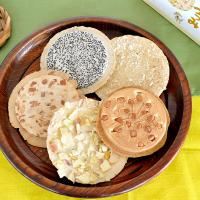 | 5種30枚 各8枚/南部せんべい(胡麻)、南部せんべい(落花生) 各6枚/いかせんべい 各4枚/まめごろう、りんごせんべい |