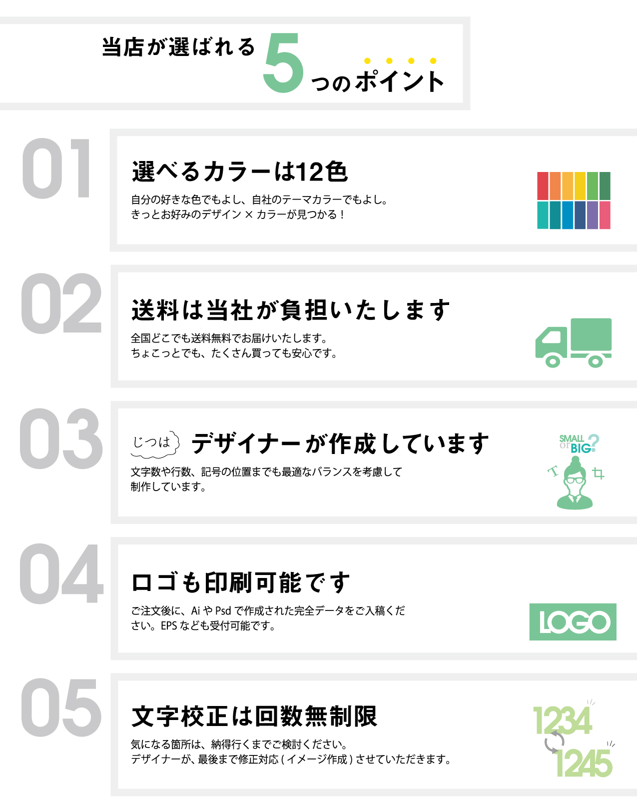 | 返品・交換 | ●印刷イメージ送付後のキャンセルは、キャンセル料がかかります。詳しくは よくあるご質問ページのキャンセル・返品についてをご確認ください。 ●商品の品質には万全を期しておりますが、万が一お届けの商品に不備(印字ミス、汚れ、枚数不足)があった場合、商品到着より7日以内にお問い合わせからご連絡ください。 早急に刷り直し、交換させていただきます。 ※オーダーメイド商品の特性上、お客さまのご都合による返品・交換はできません。 |
