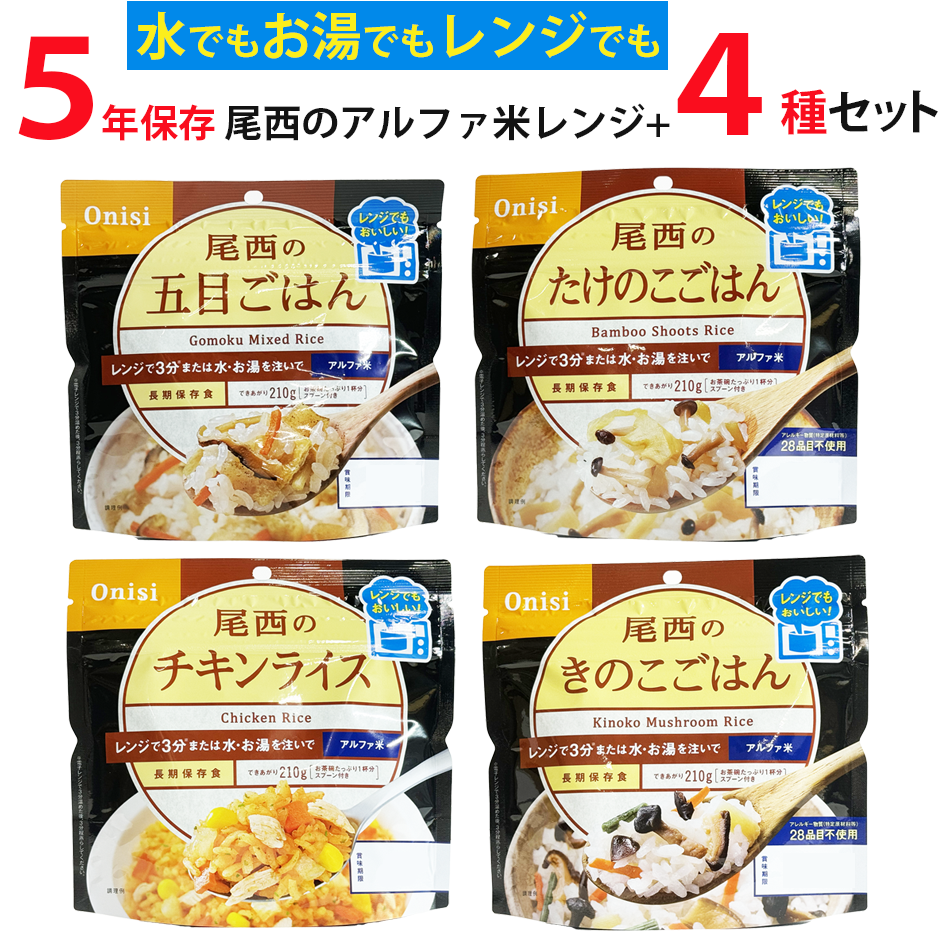 月間セール 訳あり 5年未満 長期保存 尾西のレンジ プラス 4食セット チキンライス 五目 きのこ たけのこ 各80g 非常食 保存食 アルファ米 備蓄食 災害備蓄