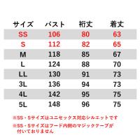 ・サイズ:SS(バスト/106、桁丈/80、着丈/62)、S(バスト/112、桁丈/82、着丈/64)、M(バスト/118、桁丈/85、着丈/67)、L(バスト/124、桁丈/88、着丈/70)、LL(バスト/130、桁丈/91、着丈/73)、3L(バスト/136、桁丈/94、着丈/73)、4L(バスト/142、桁丈/95、着丈/75)、5L(バスト/148、桁丈/96、着丈/75)