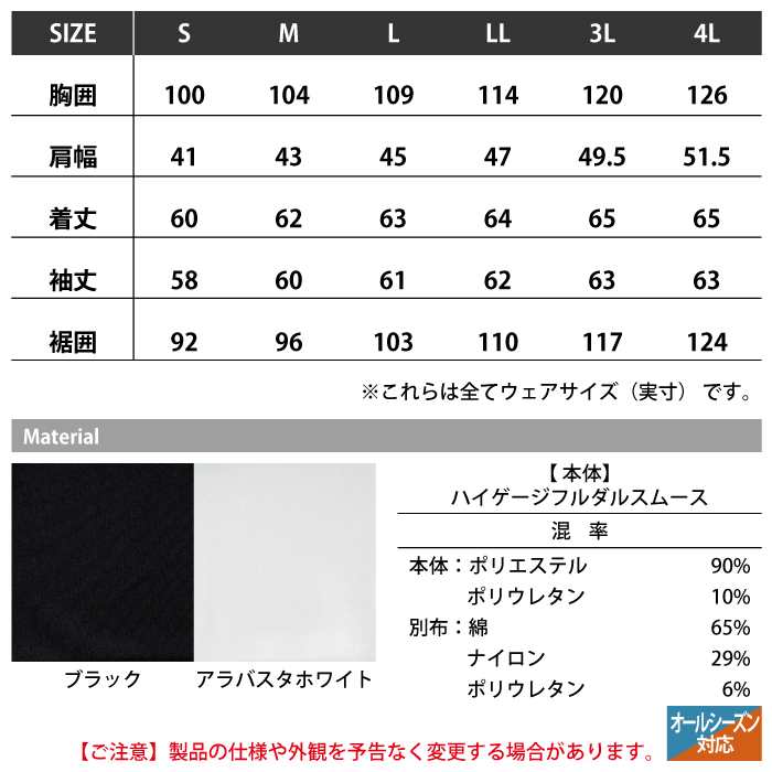 ・混率:本体345g/m2ポリエステル90%ポリウレタン10%/パーツ生地149g/m2綿65%ナイロン29%ポリウレタン6%