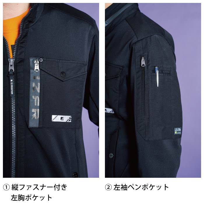 ・機能:ハイブリッドモデル快適性ストレッチ性キックバック性屈強な生地強度透け防止効果高級感縦ファスナー付左胸ポケット左袖ペンポケット右肩プリント左胸内ポケット