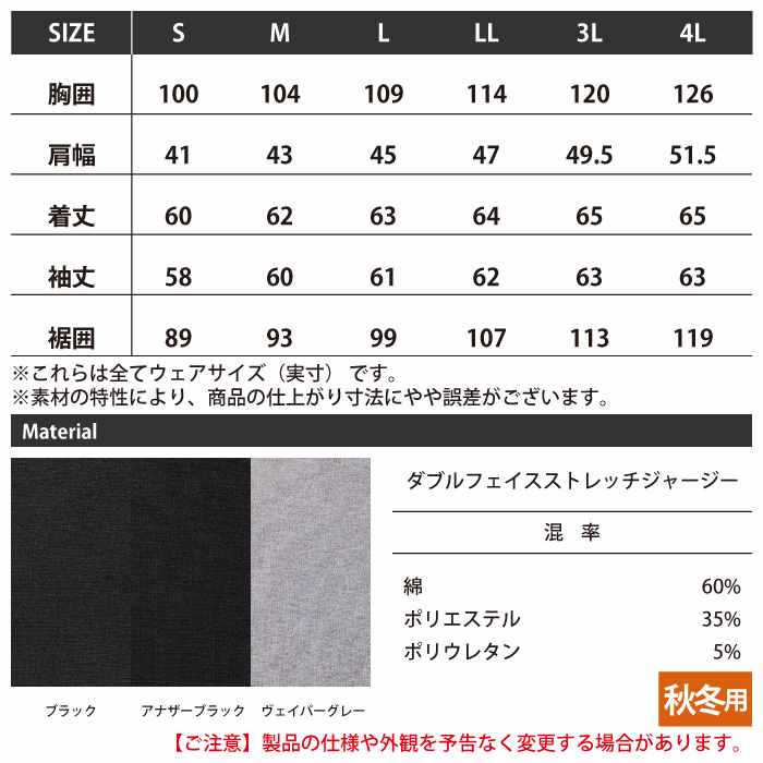 ・素材:ダブルフェイスストレッチジャージー(中国製)/綿60%・ポリエステル35%・ポリウレタン5%