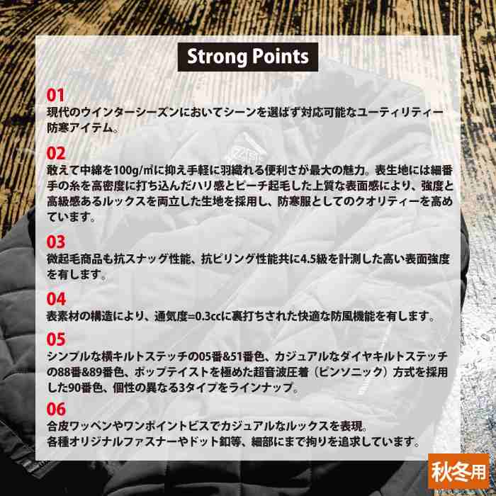 ・敢えて中綿を100g/m2に抑え手軽に羽織れる便利さが最大の魅力。表生地には細番手の糸を高密度に打ち込んだハリ感とピーチ起毛した上質な表面感により 強度と高級感のあるルックスを両立した生地を採用し 防寒服としてのクオリティーを高めています