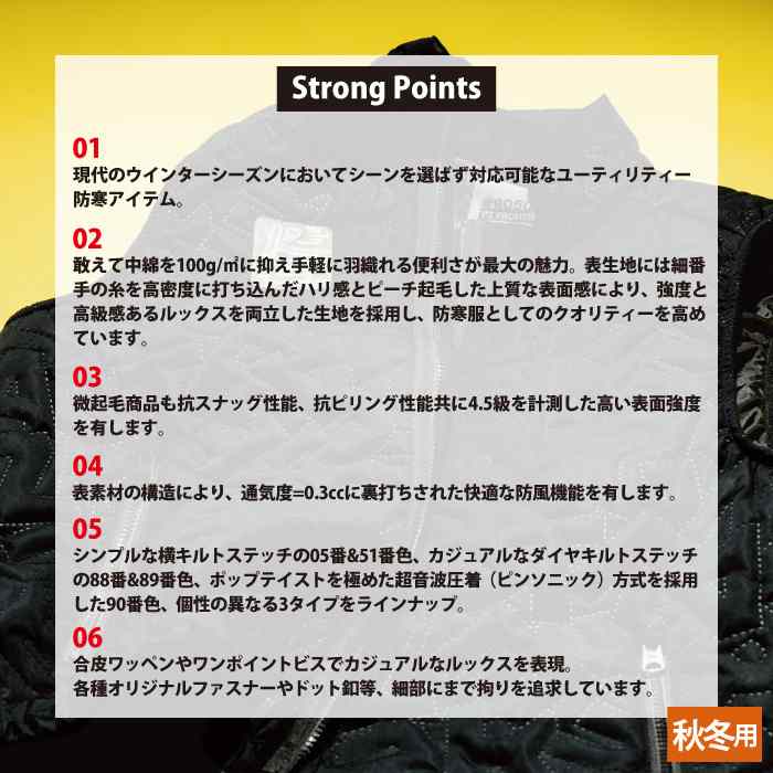 ・敢えて中綿を100g/m2に抑え手軽に羽織れる便利さが最大の魅力。表生地には細番手の糸を高密度に打ち込んだハリ感とピーチ起毛した上質な表面感により 強度と高級感のあるルックスを両立した生地を採用し 防寒服としてのクオリティーを高めています