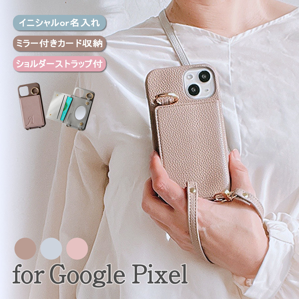GooglePixel グーグルピクセル 9a 9 9Pro 8a 7a ケース ショルダー 鏡 カード収納 「 背面 薄型 ミラー イニシャル ロングベルト 」