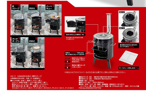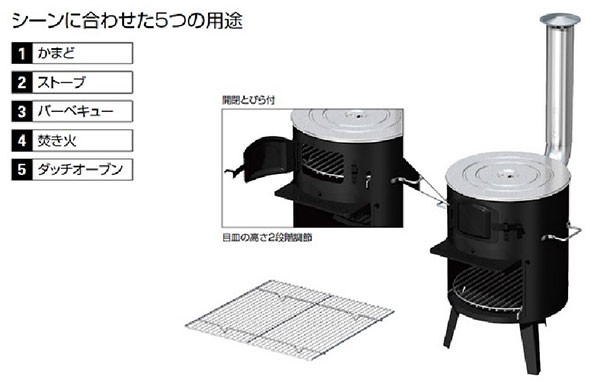 | 製品サイズ:(約)組立時/450×奥行550×高さ950mm、本体/外径360×高さ550mm、網サイズ/360×360mm ?製品重量:(約)6300g ?材質:本体、ツバ、扉、脚部/普通銅版(表面ほうろう加工)、バーベキュー網、目皿、ハンドル/鉄(クロムめっき)、組蓋/亜鉛めっき鋼板、煙突/ステンレス鋼 アウトドアシーンに合わせた5つの用途に使えるかまど型の煙突ストーブ 5つの用途に使える! 薪ストーブ、焚き火、バーベキュー、ダッチオーブン、かまどなど 目皿はハイ・ロー2段階調節 ハイ:炭、ロー:薪に適した高さにセット可能 蓋は鍋の大きさに合わせて使える組蓋式 炭のつぎたしに便利な扉付 バーベキューが楽しめる網付 |