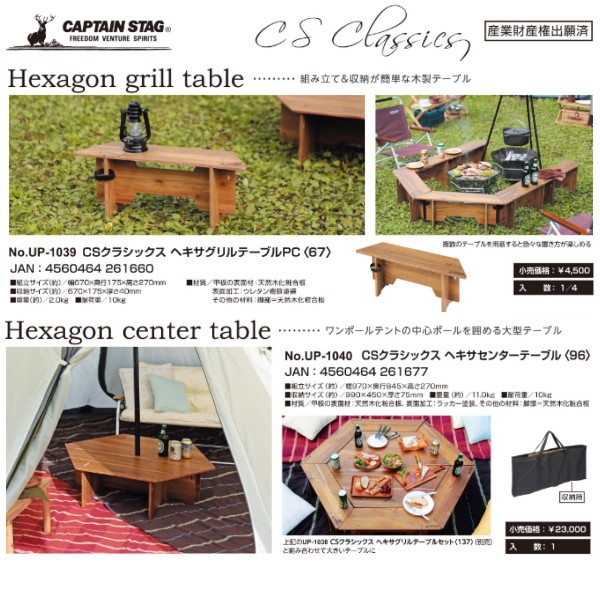 | ワンポールテントの中心ポールを囲める大型テーブルです *UP-1038 CSクラシックス ヘキサグリルテーブルセット<137>(別売)と組み合わせて大きいテーブルとして使えます | ||||||||||||||