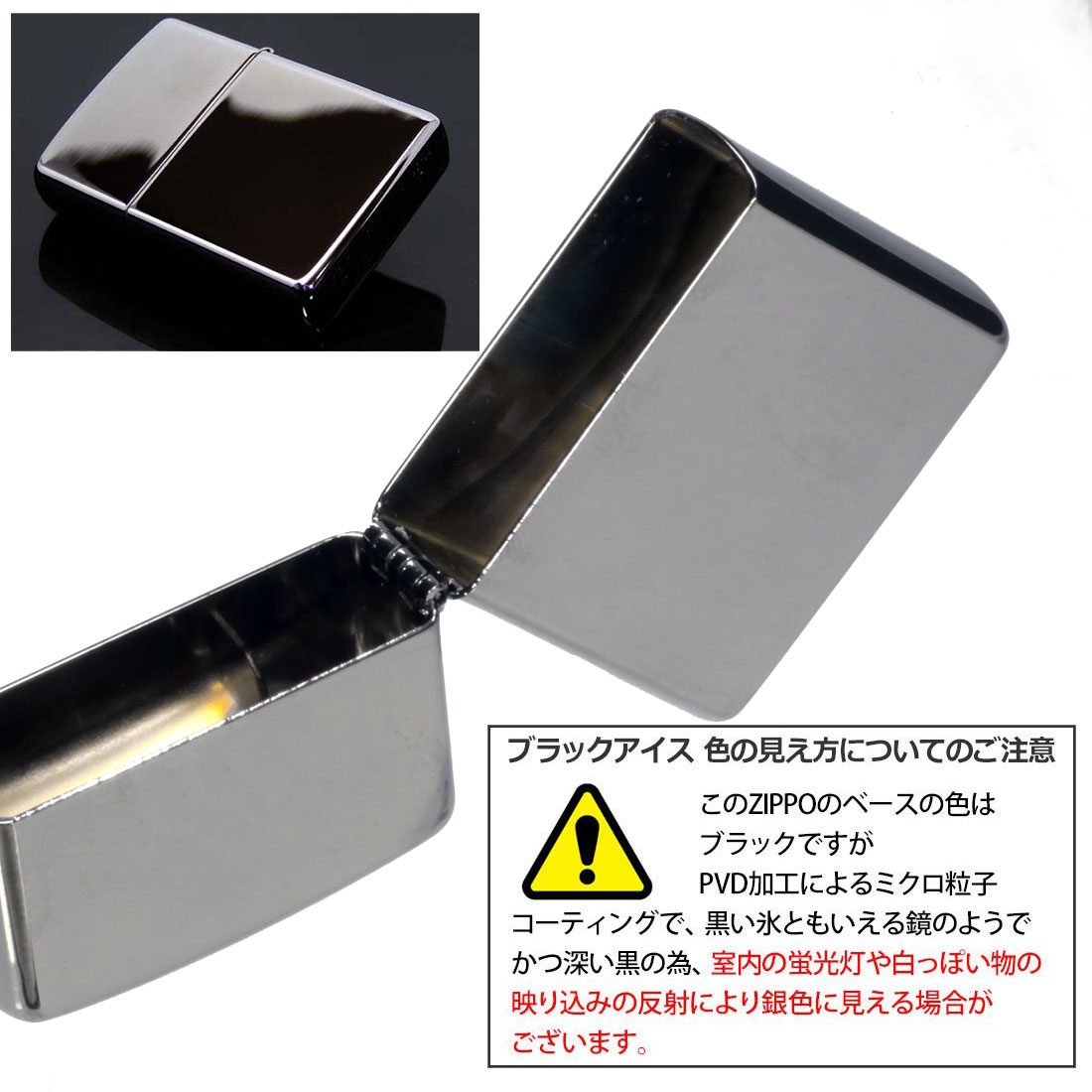 PVD加工によるミクロ粒子コーティングで黒い氷ともいえる鏡のような為、蛍光灯や明るいところでは反射により銀色に見える場合がございます。