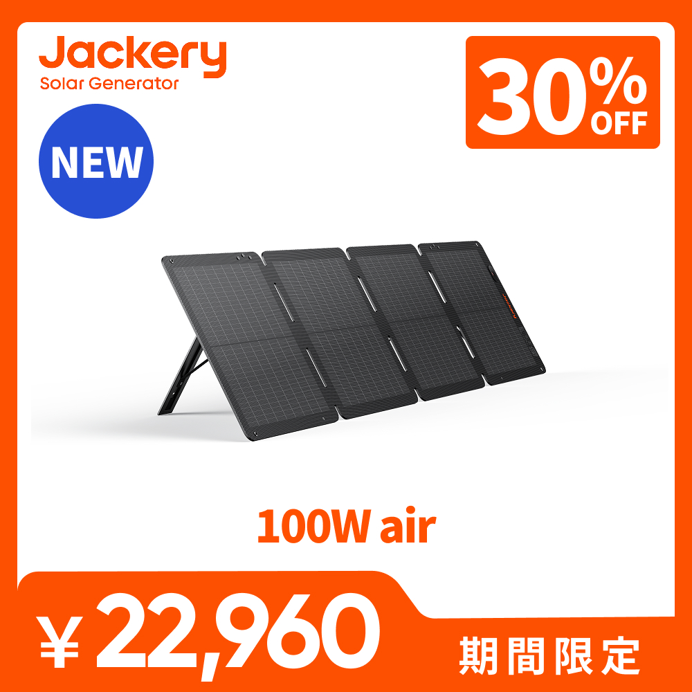 | 【ソーラーパネル・型番】JS-100I 【究極のモビリティ、世界最軽量を実現した100Wソーラーパネル】 本製品は、重量わずか3.2Kgの軽量設計。四つ折りタイプの100Wソーラーパネルとして世界最軽量*。 従来の100Wソーラーパネルよりも10%以上軽く*、片手でも持ち運べるため、女性やシニアの方でも安心です。アウトドアでも、災害時でも、すぐに使える手軽さと安心感を備えています。 *四つ折りかつ両面発電タイプの100Wソーラーパネルにおいて(※2025年6月現在、当社調べ) *従来製品:Jackery Solar Saga 100(3.6kg) 【Jackery ポータブル電源全シリーズに対応】 Jackery ポータブル電源の全シリーズに対応し、最大100Wで充電することができます。太陽の出ている時に発電した電力をポータブル電源に溜めることで、夜間や停電時でも電気を使用することができます。 【高変換効率25%パネル採用】 両面発電に加えて、最先端のTOPCON テクノロジーにより業界トップクラスの25%の変換効率を実現。 【コンパクトで持ち運び便利】 独自の4つ折り構造を採用し、展開時の折り目部分のフラットさを改善。折りたたみ時のサイズが従来製品と比べて約20%小さくなり、収納場所にも困りません。 使わないときは付属の収納バッグにコンパクトに収まり、車内やクローゼットにもすっきり収納可能。バッグには撥水加工を施した高品質素材を採用しており、移動時のキズや保管中のホコリ・汚れからもしっかり保護します。 【パネル1枚でまとめて充電に対応】 付属の充電ケーブルにはUSB-AとUSB-Cの出力端子を搭載し、ポータブル電源への充電だけでなく、スマホやタブレット端末など、2台のデバイスまで直接充電できます。 【長く安心して使える一台】 IP68準拠の防水設計で、突然の雨や厳しい天候下でも安心して使用可能(ケーブル接続口は防水ではないため、ご注意ください)。4,000回の折りたたみ耐性テストとIEC規格テストをクリアし、長く使える優れた耐久性を実現。 【使い方簡単、風にも強い安定設計】 軽量で高耐久なアルミ合金スタンドを採用し、パネルはワンタッチで展開するだけで自立できます。本体の四隅とスタンドには固定用ホールを備え、ペグを使用すれば地面にしっかり固定できるため、風の強い日も安心して使用できます。 【一目でわかる!最も効率的なソーラー発電角度】 ソーラー発電のベストな角度がすぐにわかる「太陽角度インジケーター」を搭載。インジケーターに落ちる影の様子から現在の太陽光の状態が確認でき、機器への電力供給の度合いが簡単に把握できます。 【過酷な気温でも安定動作】 ―20℃〜65℃の幅広い動作温度に対応しており、暑い夏から真冬まで、季節を問わず安定して発電可能。 【安心の3年保証】 1年間の基本保証に加えて、公式サイトで製品登録をしていただくと2年の延長保証を無償で提供。 |