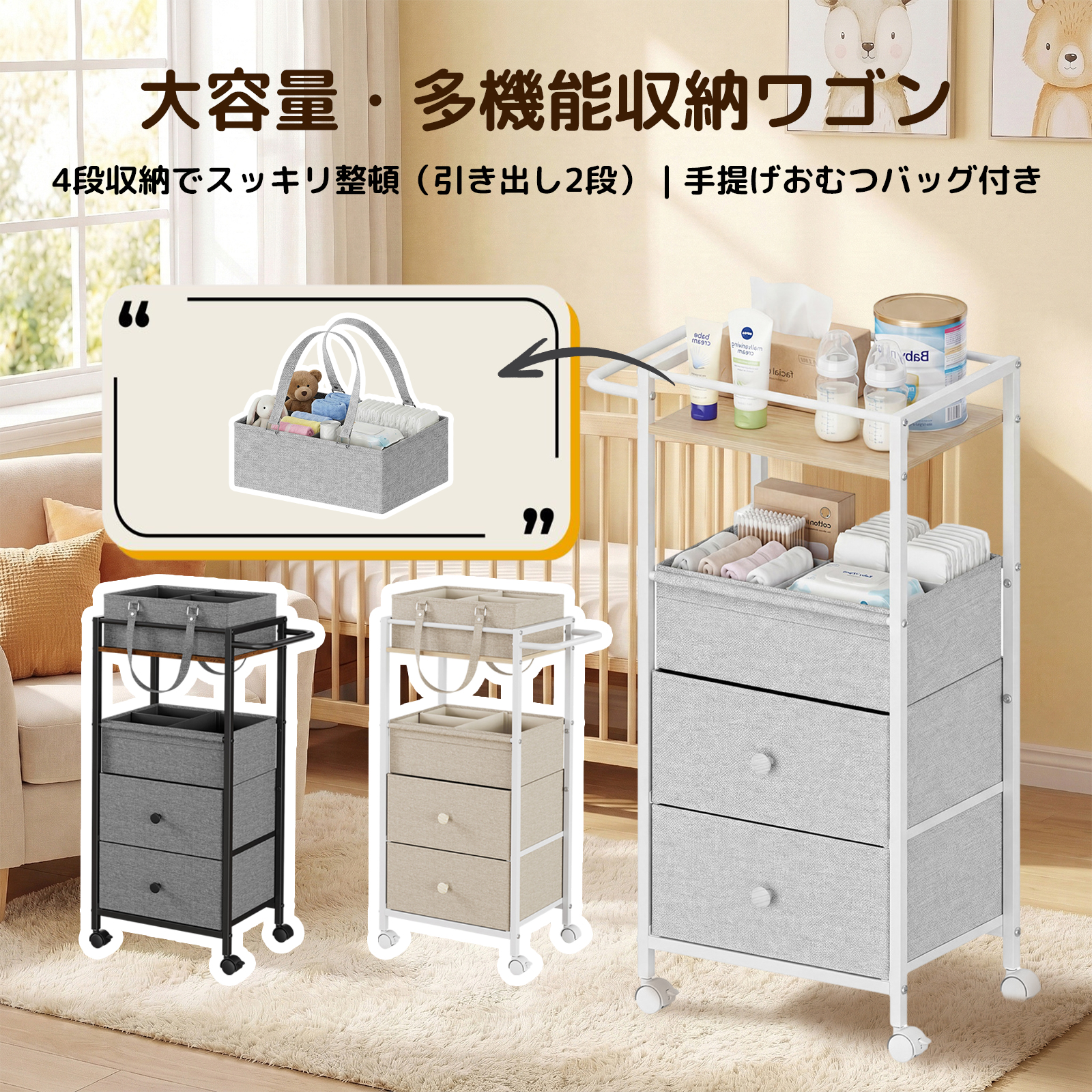おむつストッカー 2WAY 収納ワゴン 4段 キャスター付 大容量 おむつバッグ 取り外し可能 ベビー 赤ちゃん用品 出産準備 収納ボックス 仕切り