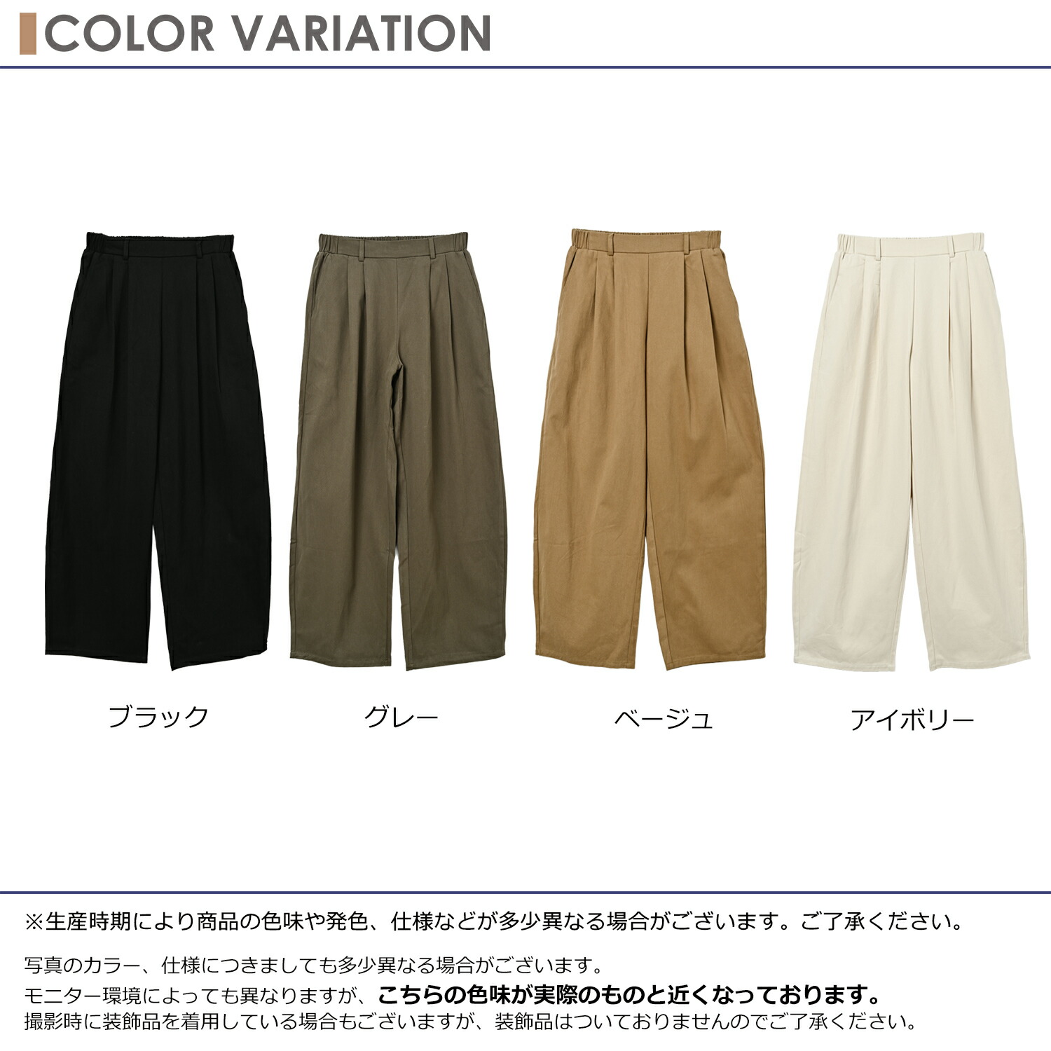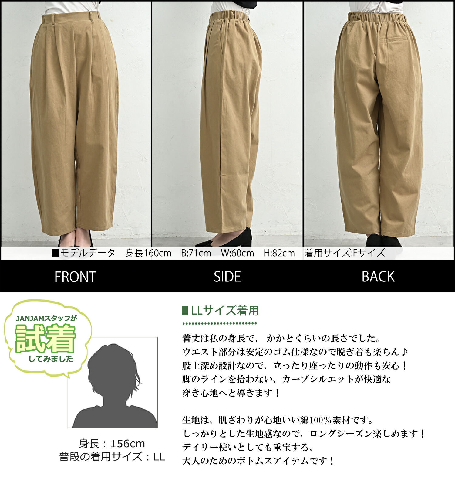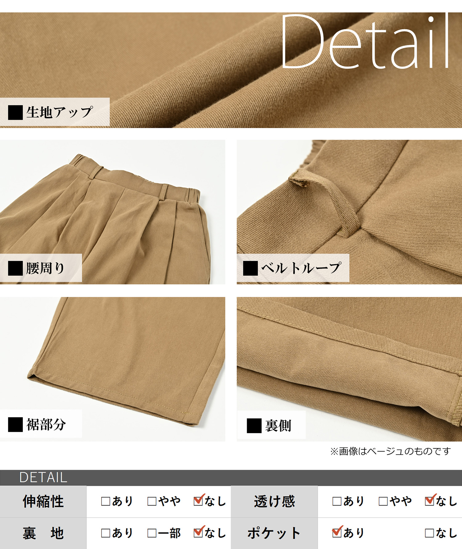 ・股まわりと後ろ姿:股ズレが起きにくいゆったりとした設計で、足さばきもスムーズです。背面は安定感のあるウエストゴム仕様。しゃがんでも背中が浮きにくく、肉厚なチノ素材がヒップラインの凹凸をしっかりカバーするため、後ろ姿にもたつきを感じさせません。