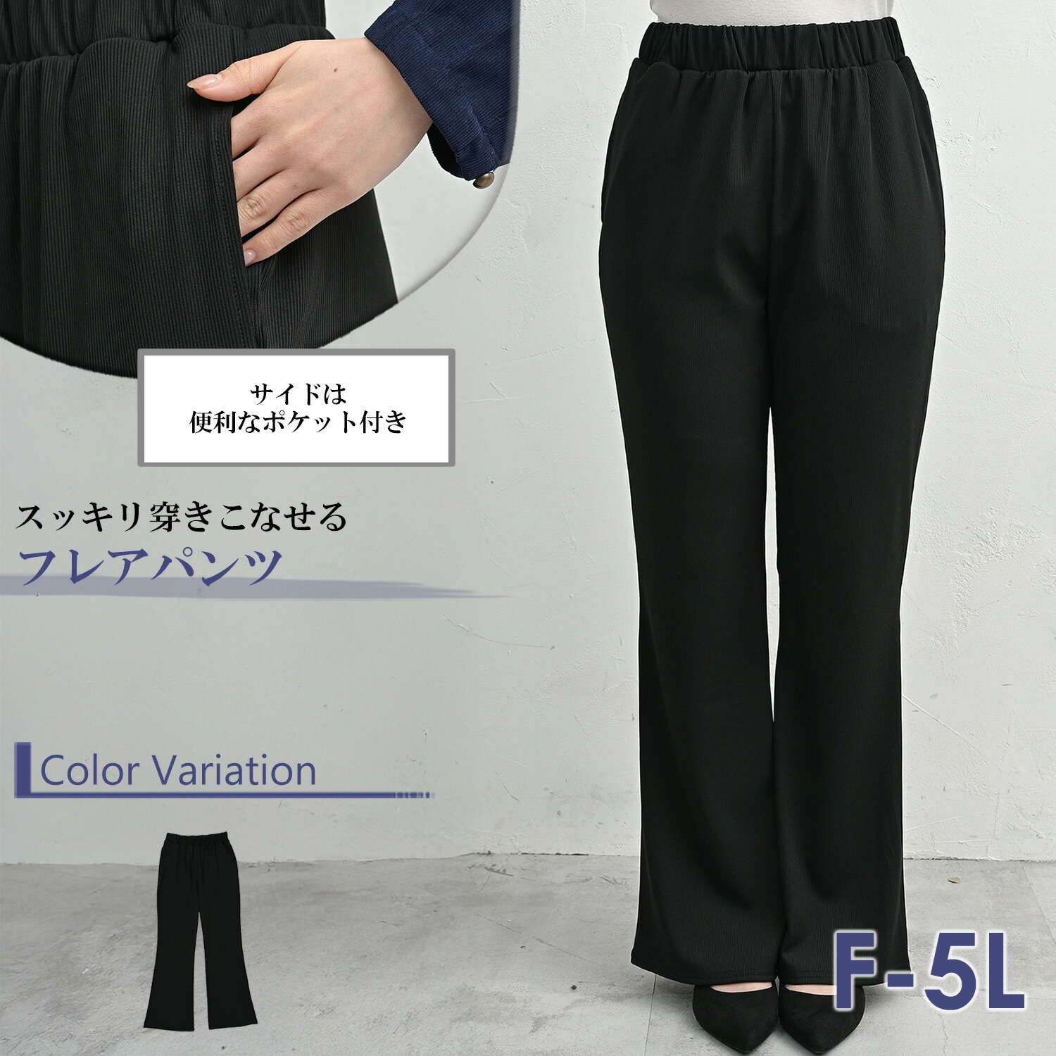 着痩せフレアパンツ 大きいサイズ レディース メール便送料無料 ロング丈 ウエストゴム イージーパンツ ボトムス F LL 3L 4L 5L