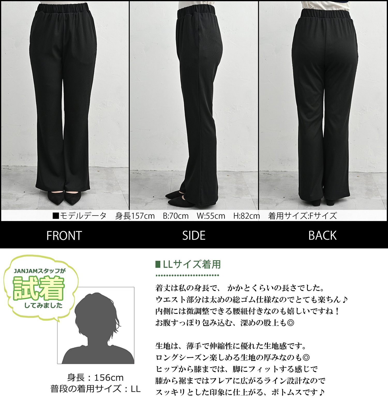 4L:ウエスト82-108 前股上32 後股上35 渡り幅32.5 股下69 裾口周56
