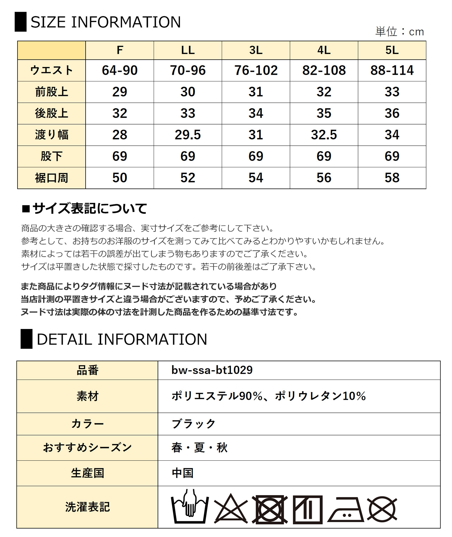 F:ウエスト64-90 前股上29 後股上32 渡り幅28 股下69 裾口周50