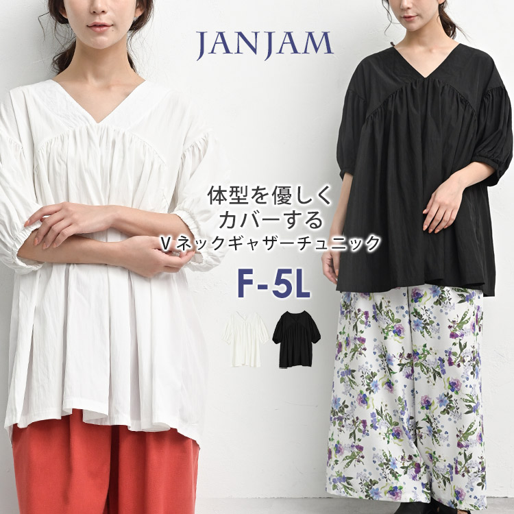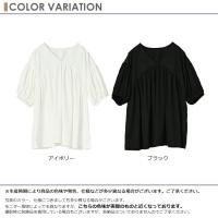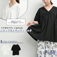ギャザーチュニック 大きいサイズ レディース メール便送料350円 Vネック 5分袖 無地 ブラウス トップス F LL-3L 4L-5L