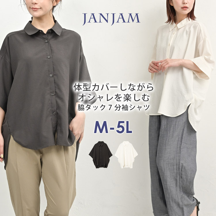 脇タックシャツ 大きいサイズ レディース メール便送料350円 7分袖 前開きボタン バックテール オフィス トップス M LL 3L 4L 5L