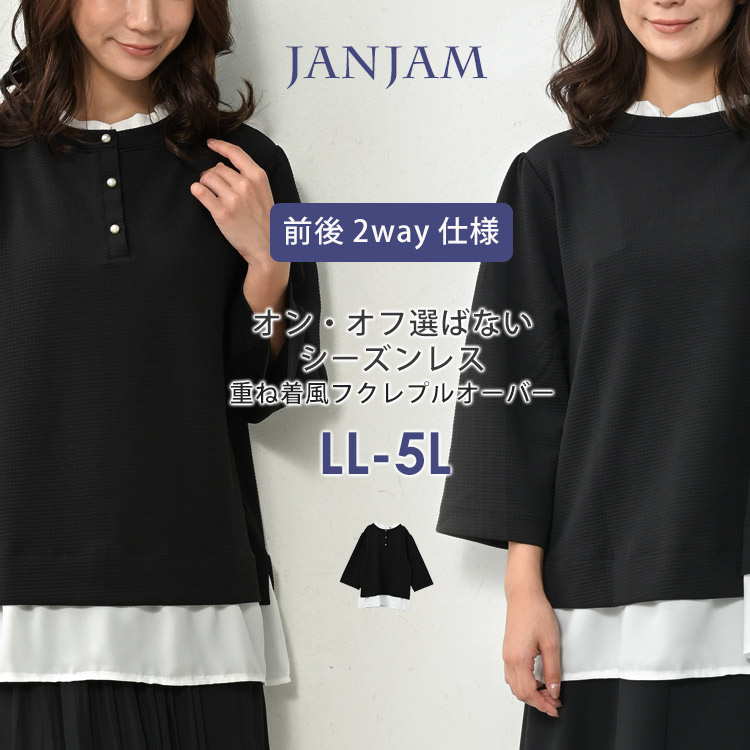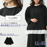 重ね着風プルオーバー 大きいサイズ レディース 前後2way フリルネック 7分袖 前開きボタン トップス LL 3L 4L 5L 送料無料※沖縄/北海道対象外