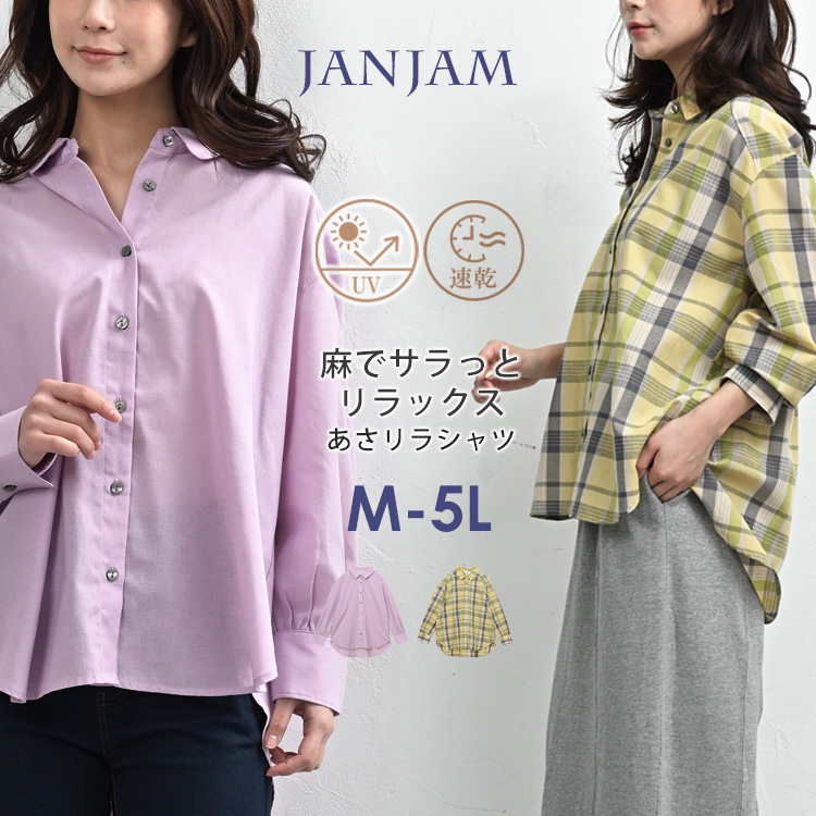麻混シャツ 大きいサイズ レディース メール便送料350円 長袖 前開きボタン あさリラ UVカット 速乾 トップス M LL 3L 4L 5L
