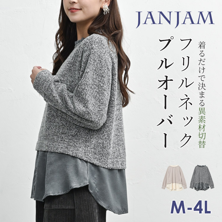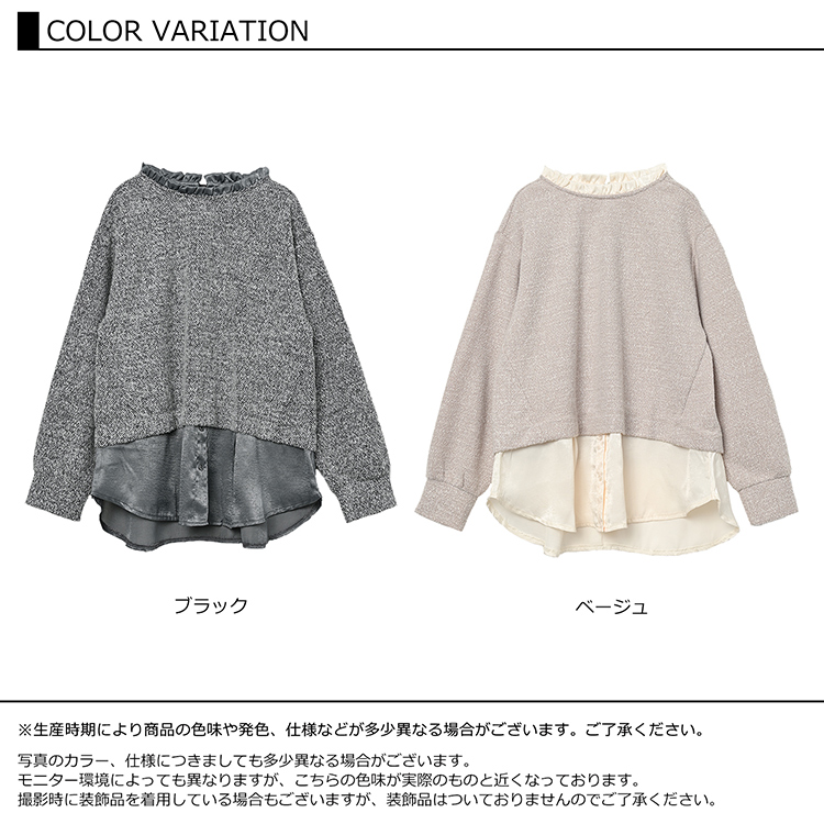 異素材切り替えプルオーバー 大きいサイズ レディース 長袖 フリルネック シャツ裾 トップス M LL 3L 4L