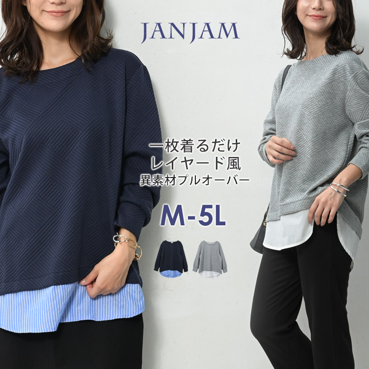 重ね着風プルオーバー 大きいサイズ レディース 長袖 幾何キルト 異素材切り替え トップス M LL 3L 4L 5L 送料無料※沖縄/北海道対象外