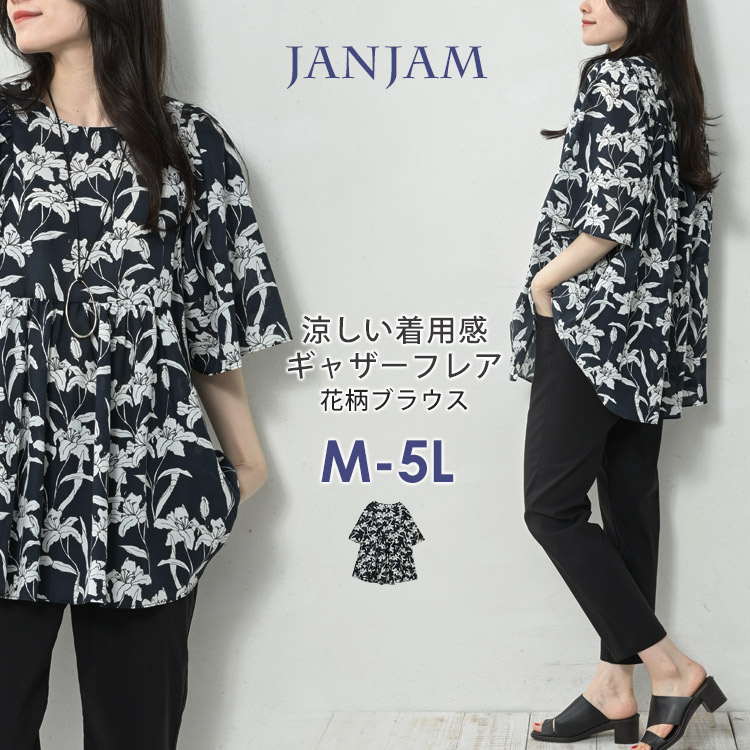 ギャザーフレアブラウス 大きいサイズ レディース メール便送料350円 5分袖 花柄 バックボタン Uネック トップス M LL 3L 4L 5L