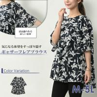 【メール便対応】ふんわり軽めの涼しい素材感。ギャザーフレア花柄ブラウス。