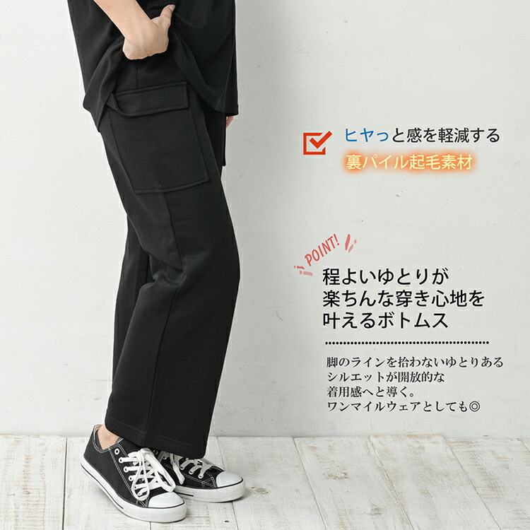 優しい暖かさの裏パイル起毛カーゴストレートパンツ。
