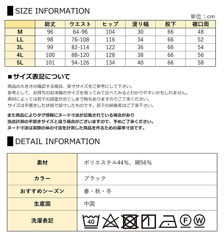 5L:総丈101 ウエスト94-126 ヒップ134 渡り幅40 股下66 裾口周58