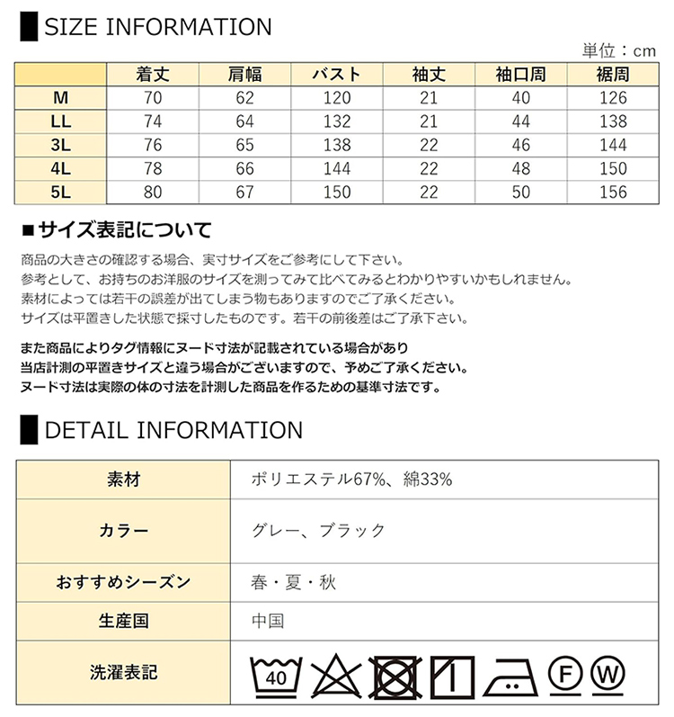 5L:着丈80 肩幅67 バスト150 袖丈22 袖口周50 裾周156